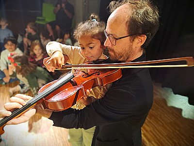 De kleuters maken al kennis met de personages, de plek waar ze wonen en de muziek van Ravel. Ook ontdekken ze in hun vertrouwde omgeving de snaarinstrumenten die terugkomen tijdens het concert in het gemeenschapscentrum.